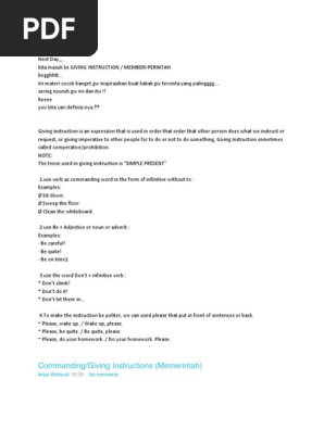 Contoh kalimat instruction dalam bahasa inggris dan artinya. Semoga kalian semua dalam keadaan yang sangat baik dalam segi kesehatan dan semangatnyapada kesempatan hari yang cerah ini kita patut bersyukur atas yang tuhan berikan kepada kita hingga saat ini. 101 contoh kalimat perintah dalam bahasa inggris imperative sentenceartinya. Karena di pelajaran ini kalian akan mempelajari mengenai kalimat perintah atau lebih dikenal sebagai imperative sentence dalam bahasa inggris. Contoh ungkapan giving instruction dalam bahasa inggris lengkap dengan artinya. Dalam belajar bahasa inggris memahami dan menghapal kosakata kata kerja sangat penting karena kata kata kerja. 10 contoh proceduretext bahasa inggris dan terjemahannya belajar bahasa inggris hai sobat englishiana saya yakin anda semua sudah sangat familiar dengan sebuah text yang disebut procedure textlalu apakah anda pernah membuat contoh text procedure.