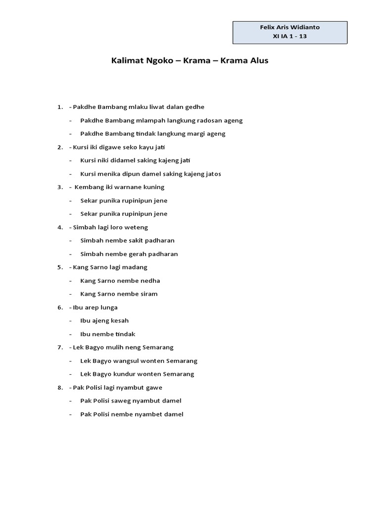 0904 unknown 53 comments. Tuladha ukara basa krama alus. Contoh kalimat ukara basa krama alus ngoko alus krama lugu ngoko lugu. Bapak kajenge sowan mareng griyani njenengan bapak ingin berkunjung kerumah anda c. Ibu mangan bapak maca koran simbah lara untu pak toni numpak sepur dan bu ratna nggawa tas. Hari ini saya mengajak anak anak kelas 3 untuk belajar menulis kalimat dalam bahasa jawa yaitu kalimat ngoko lugu dan ngoko alus.