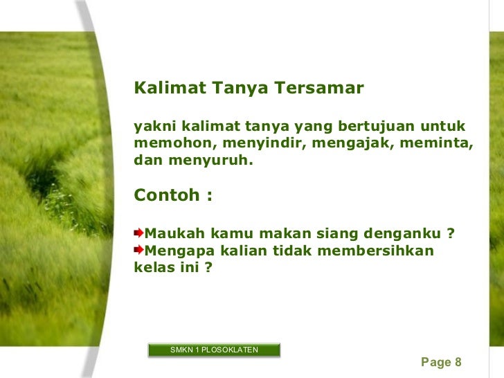 Dengan kalimat tanya tersamar penanya dapat menyampaikan berbagai tujuan seperti memohon meminta menyindir membiarkan mengajak menegaskan menyetujui menggugah melarang menyuruh dan lain sebagainya. Berikut adalah beberapa contoh dari kalimat tanya tersamar. Apakah kemiskinan di negeri ini harus terus dibiarkan. Contoh kalimat tanya tersamar sesuai dengan namanya kalimat tanya adalah kalimat yang mengandung makna berupa pertanyaan. Kalimat tanya retoris kalimat ini adalah kalimat tanya tanpa jawaban karena sebenarnya dia sudah mengetahui jawabannya. Kalimat tanya tersamar maksudnya adalah bentuk kalimat tanya yang mengacu pada bermacam maksud.