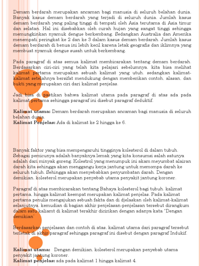 Kalimat penjelas sendiri adalah kalimat yang memiliki sifat khusus dan kalimat penjelas dapat berfungsi sebagai kalimat pengembang dari suatu gagasan utama dalam sebuah paragraf. Untuk mendukung kalimat utama tersebut kalimat penjelas biasanya berupa contoh data uraian penjelasan dari kalimat utama. Ide pokoknya adalah dampak buruk dosa. Contoh kalimat utama di awal paragraf deduktif memasuki arus globalisasi beberapa hal terkait iptek yang semakin canggih menjadi boomerang bagi masyarakat indonesia. Umum kalimat penjelas khusus kalimat penjelas khusus kalimat utama. Kalimat utama terletak di awal dan akhir paragraf campuran kalimat utama.