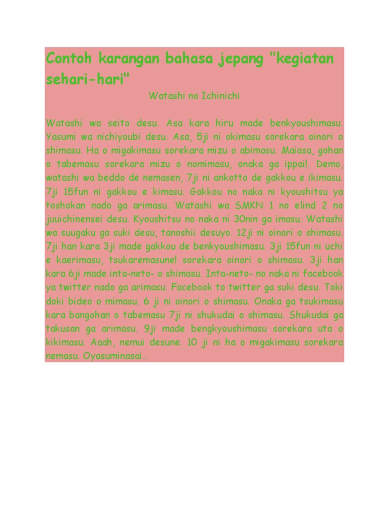 Pengen banget baca tapi belum bisa baca huruf jepang hiraganakatakanakanji. Klik di sini untuk informasi file lengkap karangan bahasa jepang tentang hobi beserta artinya selengkapnya. Contoh karangan bahasa jepang tentang perkenalan diri. Watashi no namae wa tika desu. Oleh karena itu untuk kalian yang benar benar berniat menguasai bahasa jepang berikut akan kami paparkan kumpulan contoh percakapan bahasa jepang beserta artinya. Mungkin ada yang mau tau karangan jepang tu bagaimana.