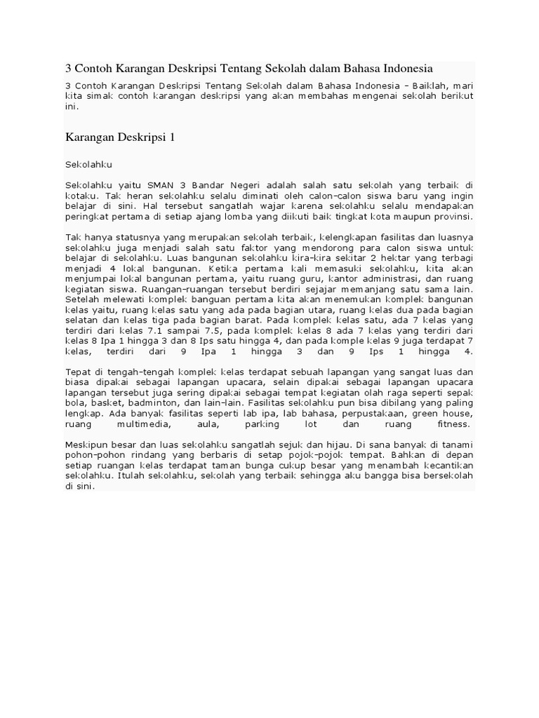 Contoh karangan tentang sekolahku. Karena hal tersebut sudah sangat lazim dilakukan oleh para pendaki. A school is where people learn and study. Karangan bahasa inggris tentang sekolah. Teks deksripsi tentang alam. Contoh teks deskripsi ketika kita ingin mengetahui informasi rinci mengenai suatu objek yang bisa berupa barang maupun lainnya padahal kita belum pernah melihatnya secara langsung disitu lah kita butuh teks deskripsi. Malah kita dapat melihat di dinding dinding sekolah juga terukir ungkapan tersebut.