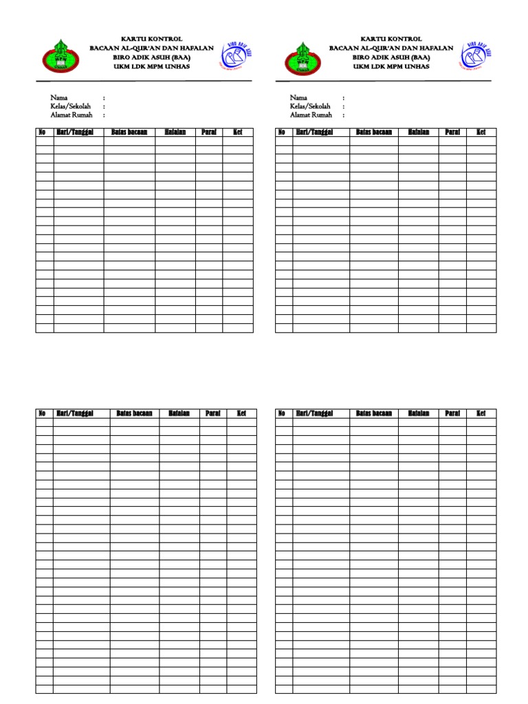 Contoh kartu setoran hafalan qur an. Buku setoran hafalan al quran juz 29 30 yang disusun untuk memudahkan dalam menghafal al quran. Bila bacaannya telah benar dan lancar maka diparaf pada kolom sorogsetor baca pada baris pertamabagi santri kecil yang belum bisa membaca al quran pun bisa dengan disorog hafalan yaitu kita membacakan dan satri tersebut mendegnarkan dan mengikuti samapi lancar. Buku ini disusun atas permintaan sekolah kehidupan al qomar yang meminta untuk dibuatkan buku setoran hafalan al quran dengan target dua juz juz 29 30 dan urutannya mundur dari surat an naas dulu. Jika tiba masamu pilihlah suami yang shaleh bersahaja tidak kaya tidak miskin fasih membaca al quran fasih mengumandangkan kebenaran dan keadilan setia dalam cinta. Daftar hafalan surat juz 30. Berikut informasi sepenuhnya tentang contoh buku setoran hafalan qur an.