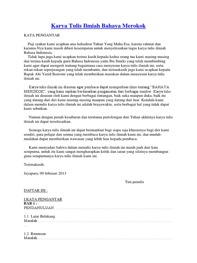 Karya ilmiah tentang bahaya merokok kata pengantar syukur alhamdulillah merupakan satu kata yang sangat pantas penulis ucapkan kepada allah swt yang karena bimbingan nya maka penulis bisa menyelesaikan sebuah karya tulis yang berjudl bahaya merokok bagi pelajar. Karya ilmiah ini di susun oleh kelompok kami. Contoh karya tulis ilmiah tentang bahaya merokokkumpulan makalah ilmiahcontoh karya tulis ilmiah tentang bahaya merokok. Post kali ini saya ingin membantu teman yang kesulitan mencari contoh karya ilmiah tentang bahaya merokok. Hal itu sangat menggangu kesehatan. Melalui resolusi tahun 1983 organisasi kesehatan dunia who telah menetapkan tanggal 31 mei sebagai hari bebas tembakau sedunia setiap tahunbahaya merokok terhadap kesehatan tubuh telah diteliti dan dibuktikan oleh banyak orangefek efek yang merugikan akibat merokok pun sudah diketahui dengan jelasbanyak penelitian membuktikan bahwa kebiasaan merokok meningkatkan risiko timbulnya berbagai.