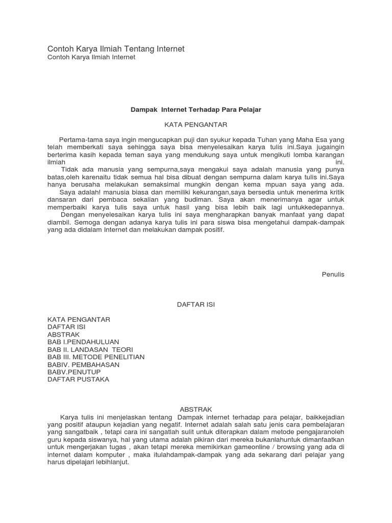 Contoh karya tulis ilmiah populer sederhana formal non formal tentang pendidikan sampah pergaulan bebas pencemaran air bahaya rokok narkoba kesehatan kenakalan remaja lingkungan yang baik dan benar. Penulisan karya ilmiah dilakukan secara runtut dan sistematis. Pengaruh internet terhadap prestasi siswa disusun oleh. Newer post older post home. Contoh karya tulis ilmia tentang internet terhadap para pelajar memang untuk internet saat ini sangat berkembang sangat cepat sekali sehingga sangat meluas di kalangan pelajar. Karya tulis ini menjelaskan tentang dampak internet terhadap para pelajar baikkejadian yang positif ataupun kejadian yang negatif.
