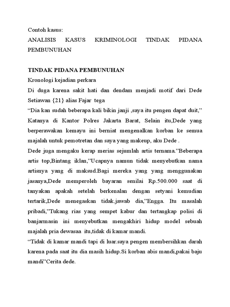 Contoh kasus yang akan saya angkat dalam makalah ini salah satunya adalah mengenai kejahatan pembunuhan yang dilakukan oleh wni di negera mesir dalam kasus ini negara indonesia bisa saja mengadili warga. Pakar hukum pidana universitas trisakti usakti abdul fickar hadjar mengatakan terpidana kasus pengalihan hak tagih bank bali djoko sugiarto tjandra adalah buronan sejak tahun 2009 lalu. Tentang kasus pembunuhan berencana. Di desa telang kecamatan kamal. Unsur subyektif telah terpenuhi yaitu memang r melaukan pembunuhan tersebut dengan sengaja dan dengan rencana lebih dahulu. Kasus posisi tindak pidana pembunuhan berencana yang terjadi di desa telang kec kamal tepatnya di jalan raya masuk kampus universitas tunojoyo dengan tersangka sahri 41 warga desa buluh kecsocah dengan di temani teman tersangka yang mengakibatkan terbunuhnya ahmad hefi.