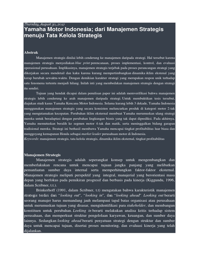 Contoh kasus manajemen strategi. Manajemen risiko suatu proses dalam kegiatan identifikasi menganalisis memberi penilaian pengendalian upaya meminimalisir atau bahkan menghapus resiko yang tidak diterima. Tugas manajemen pemasaran i survei pasar mcdonalds menggait pelanggan dengan bahan organik oleh kelompok 6. Dalam manajemen strategi ini yang paling utama adalah membangun proses bisnis yang efektif efisien. Academiaedu is a platform for academics to share research papers. Proses manajemen strategi akan memberikan hasil keputusan terbaik dikarenakan interaksi kelompok mengumpulkan berbagai strategi yang lebih besar. Sehingga dengan proses bisnis yang efektif efisiensi ini mereka mampu menekan biaya produksi sehingga dengan manajemen strategi ini mereka mampu menjual produknya dengan harga yang lebih kompetitif dibanding kompetitor kompetitornya.