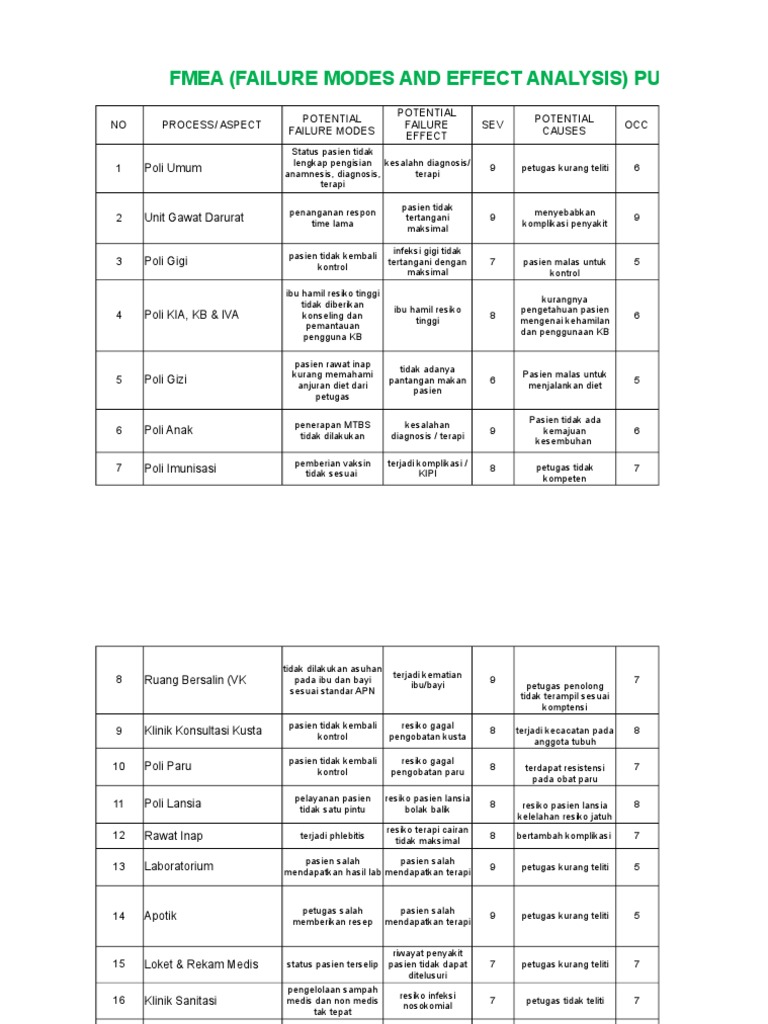 Contoh kasus penerapan fmea. Di puskesmas juga ada kalanya kita harus membuat form failure mode effect analysis fmeaberbeda dengan rca analisis akar masalah pada fmea ini lebih ke pada mengatasi kejadian kejadian yang menimbulkan resiko yang belum terjadi atau bisa saja akan terjadi dimasa datang. Fmea failure mode and effects analysis adalah alat yang digunakan secara luas pada industri otomotif aerospace dan elektronik untuk mengidentifikasi memprioritaskan dan mengeliminasi potensi kegagalan masalah dan kesalahan sistem pada desain sebelum produk. Dalam penelitian ini menggunakan metode fmea yang digunakan untuk mengidentifikasi failure mode terbesar dan efeknya yang menyebabkan kecacatan pada cetakan lks. Contoh fmea fmea memberikan gambaran mendetail mengenai seluruh kemungkinanpotensi kegagalan. Dengan bergai macam cara. Format tabel dapat bervariasi.