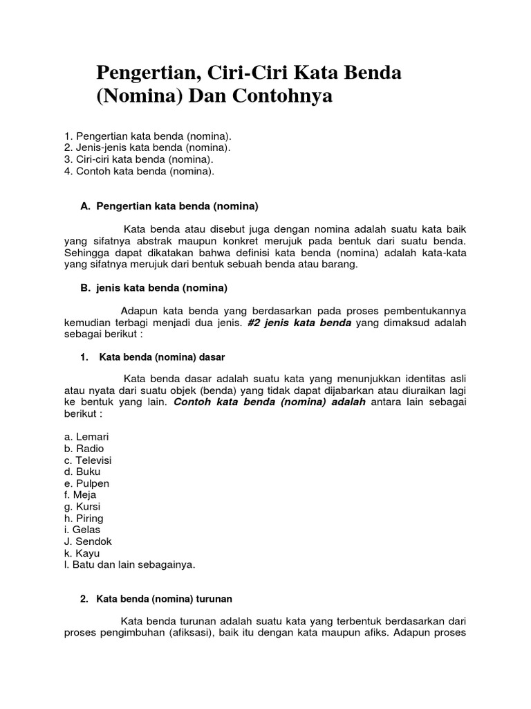Contoh kata benda nomina. Kata benda dasar atau nomina dasar ialah kata kata yang yang secara konkret menunjukkan identitas suatu benda sehingga kata ini sudah tidak bisa lagi diuraikan ke bentuk lainnya. Nomina dapat dilihat dari tiga segi yaitu semantis sintaksis dan bentuk. Kata benda nomina dasar. Kata benda atau kata benda adalah kelas kata yang dalam bahasa indonesia ditandai dengan ketidakmampuan untuk bergabung. Kata benda memiliki pengertian yaitu sebuah kata yang fungsinya atau memiliki kegunaan untuk mengacu ke suatu hal yang akan dibendakan. Kata benda sering disandingkan dengan berbagai jenis kata lainnya seperti kata kerja kata sifat kata keterangan dan lain sebagainya.