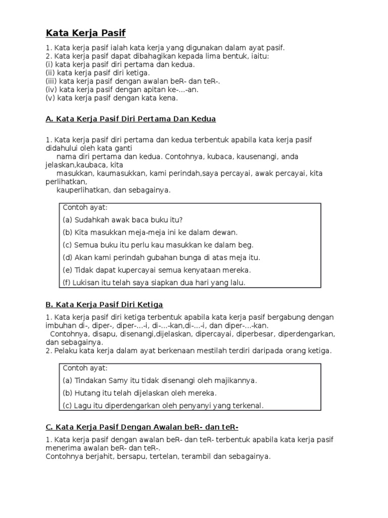 Kalimat pasif kalimat pasif merupakan kalimat yang subjeknya dikenai pekerjaan. Predikatnya berimbuhan di ter ke an ter kan. Contoh kata kerja refleksi misalnya. Pengertian kata kerja refleksi ini merupakan kata kerja yang objeknya adalah diri sendiri. Contoh kalimat pasif verba majemuk. Kata kerja pasif biasanya mendapat imbuhan di seperti.