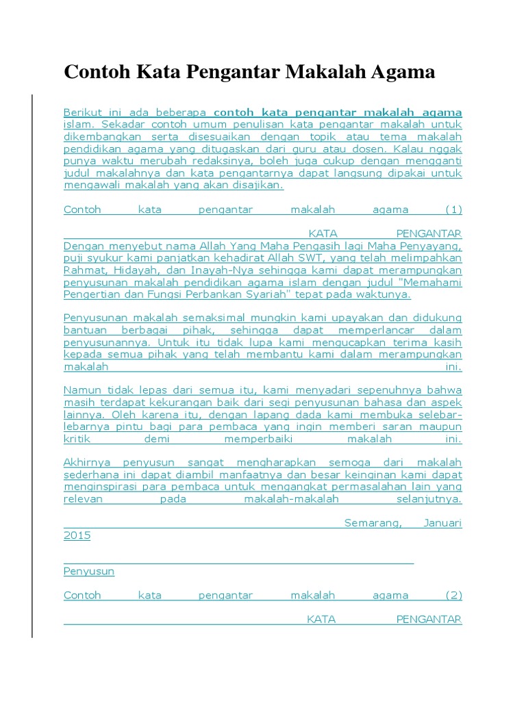 Contoh kata pengantar makalah agama 1 kata pengantar dengan menyebut nama allah yang maha pengasih lagi maha penyayang puji syukur kami panjatkan kehadirat allah swt yang telah melimpahkan rahmat hidayah dan inayah nya sehingga kami dapat merampungkan penyusunan makalah pendidikan agama islam dengan judul memahami pengertian dan fungsi perbankan syariah tepat pada waktunya. Shalawat dan salam selalu tercurahkan kepada rasulullah saw. Penulis menyadari sepenuhnya bahwa penyusunan makalah ini dapat terselesaikan berkat bantuan dari berbagai pihak baik secara langsung maupun tidak langsung. Berkat limpahan dan rahmat nya penyusun mampu menyelesaikan tugas makalah ini guna memenuhi tugas mata kuliah agama islam. Makalah ini berjudul pe laksanaan pendidikan agama islam di lingkungan keluarga. Shalawat dan salam selalu tercurahkan kepada rasulullah saw.