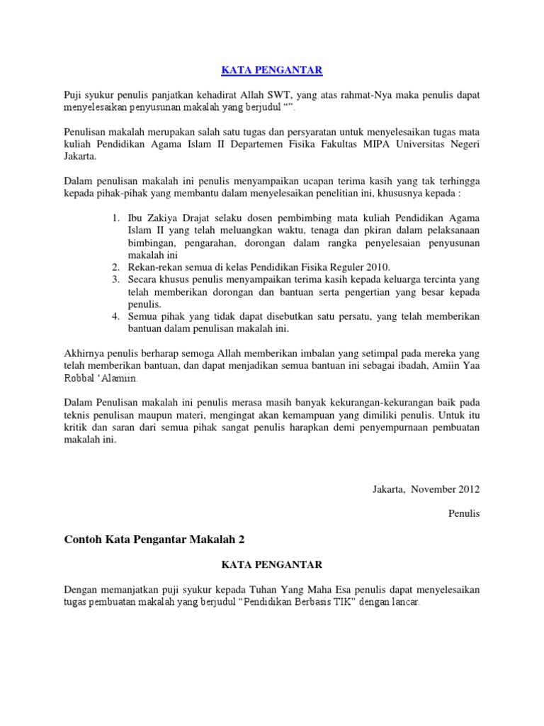 Kata pengatar adalah mukaddimah dari sebuah makalah. Puji syukur penyusun panjatkan ke hadirat allah subhanahu wataala. Adapun tujuan dari penulisan dari makalah ini adalah untuk memenuhi tugas dosenguru pada bidang studimata kuliah nama bidang studimata kuliahselain itu makalah ini juga bertujuan untuk. Contoh kata pengantar dalam membuat sebuah karya ilmiah anda diharuskan untuk menulis secara terperinci yang berisikan halaman kata pengantar halaman daftar isi isi dan terakhir penutup. Jika iya tidak ada salahnya anda simak dan pelajari 10 contoh kata pengantar yang kami bagikan di bawah ini. Kami menghaturkan syukur yang paling dalam bagi allah yang maha pembimbing.