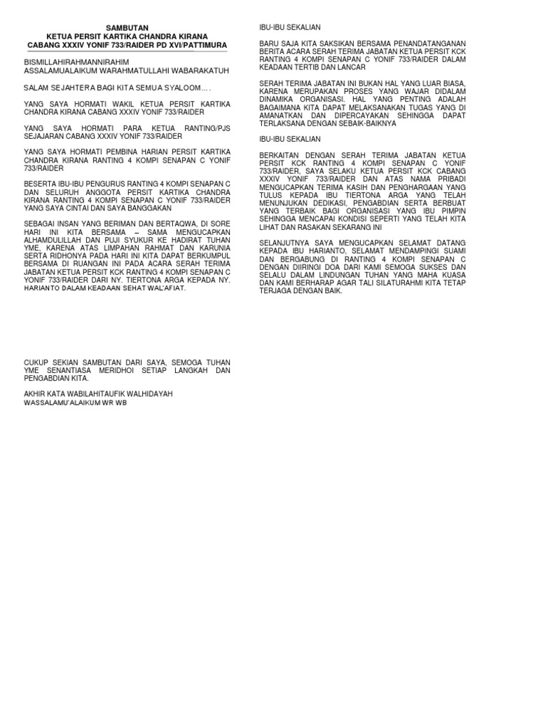 Contoh kata sambutan ketua organisasi. Contoh sambutan ketua di hut organisasinya. Kata sambutan adalah suatu kalimat atau kata kata yang. Dalam sambutan ketua organisasi ini diberikan pembukaan dan juga ucapan terima kasih atas pihak yang telah hadir. Yang saya hormati jajaran pengurus organisasi nama organisasi. Contoh kata sambutan ketua organisasi. Menyusun teks pidato sambutan ketua panitia dengan teks pidato sambutan ketua organisasi adalah dua hal yang sangat berbeda namun yang sering terjadi adalah tumpang tindih antara materi yang disampaikan ketua panitia kegiatan organisasi dengan pimpinan organisasi.
