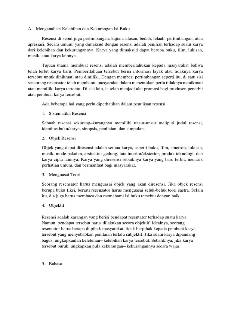Penulisan resensi harus berdasarkan pengamatan yang kritis serta berimbang antara kelebihan dan kekurangan. Lengkap dengan kelebihan dan kekurangan. Biasanya resensi mengandung kelebihan kekurangan dan informasi dari buku yang hendak disampaikan ke pembaca. Kumpulan contoh resensi buku non fiksi pengetahuan pelajaran ilmiah buku fiksi dll. Menulis resensi terdiri dari kelebihan kekurangan dan informasi yang. Sebuah resensi penting untuk seorang pembaca karena dengan mengetahui ulasan sebuah buku yang akan dibaca.