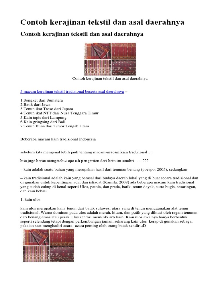 Contoh kerajinan tekstil tradisional. Dan ada beberapa jenis kerajinan tekstil yang harus kita ketahui terlebih dahulu. Yang berbahan utama dari kain contohnya seperti produk kerajinan tekstil. Pastinya jika anda mau mencoba kerajinan ini maka uang yang anda keluarkan akan sedikit berkurang. Pengertian contoh kerajinan tekstil adalah sebuah karya yang dibuat dari bahan limbah tekstil. Tekstil merupakan material fleksible yang dibuat dari tenunan benang. Sebagai pemenuhan kebutuhan sandang yang melindungi tubuh seperti kain panjang sarung dan baju daerah sebagain alat bantu atau alat rumah tangga seperti kain gendongan bayi dan untuk membawa barang.