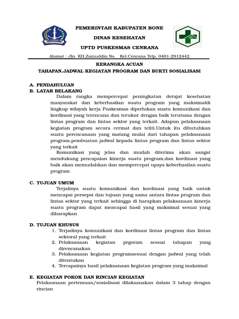 Pemerintah kabupaten magelang u nit esselon. Memuat gambaran umum latar belakang suatu kegiatan strategi capaian tujuan penerima manfaat peserta waktu kegiatan dan biaya yang diperlukan. Dengan semakin banyaknya kegiatan sosialisasi deseminasi workshop advokasi bimbingan fasilitasi rapat koordinasi. Term of reference atau disingkat tor dalam pengertian bahasa indonesia disebut dengan kerangka acuan kerja atau disingkat kak. 2 tahapan pelaksanaan kegiatan sosialisasi perencanaan program 2016 urutan kegiatannya adalah sebagai berikut.