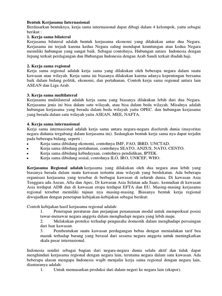 Yang tiap kerjasama dilakukan atas dasar manfaat. Kerjasama antarnegara bentuknya bermacam macam mulai kerjasama ekonomi perdagangan dan lain lain. Manfaat kerjasama antar negara. Dari segi wilayahnya kerjasama. Contoh dari bentuk kerja sama multilateral ini adalah pbb. Untuk lebih jelasnya lagi kami akan mengulas materi kerja sama ini secara lengkap mulai dari pengertian kerja sama manfaat bentuk kerjasama dan contoh kerjasama.