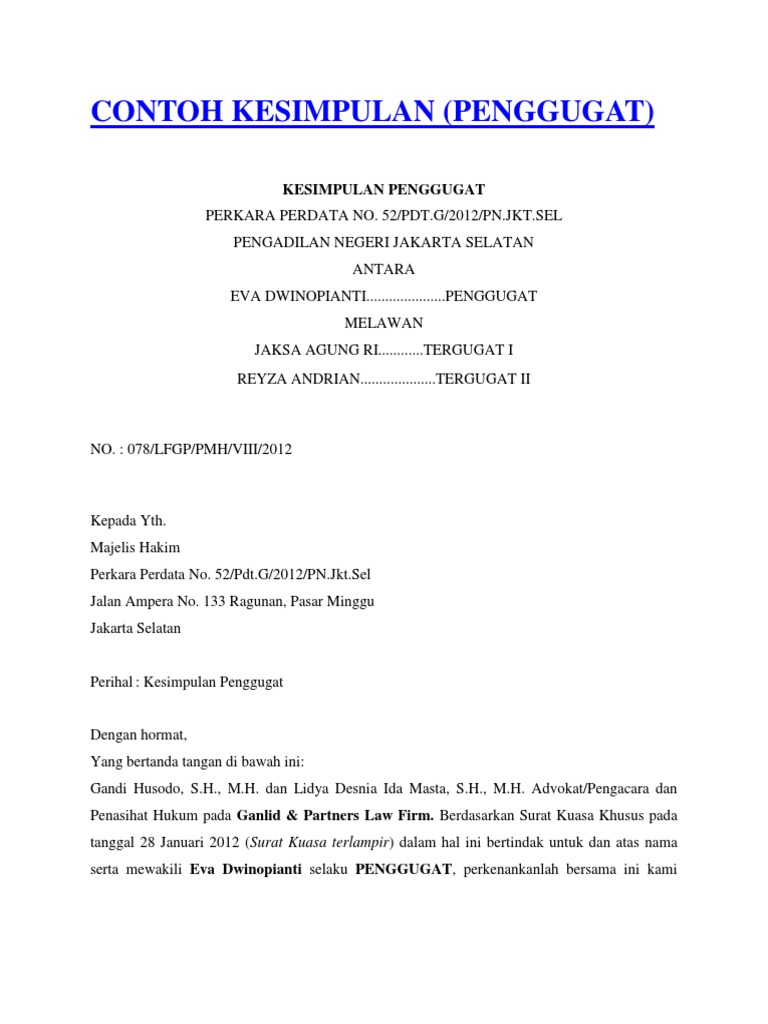 Dalam perkara perdata no. Kesimpulan perkara perdata. Advokatpengacara dan penasihat hukum pada dimpah dan rekan law firmberdasarkan surat kuasa khusus pada tanggal 3 maret 2012 surat kuasa terlampir dalam hal ini bertindak untuk dan atas nama serta mewakili reyza andrian selaku tergugat ii perkenankanlah bersama ini kami menyampaikan kesimpulan dalam perkara perdata no. Dan pahlawan agdesseno sh mh. Contoh kesimpulan dalam perkara perdata toggle sidebar setelah melalui beberapa tahapan beracara pada peradilan perdata mulai dari pembacaan gugatan jawaban atas gugatan dari tergugat replik duplik pembuktian akirnya masing masing pihak yang berperkara sampai pada kesimpulan masing masing atas proses pemeriksaaan perkara di pengadilan. Contoh duplik perdata 0515 0522 1 0508 0515 2 0501 0508 2 0417 0424 1 0403 0410 2 0327 0403 2 total tayangan halaman.