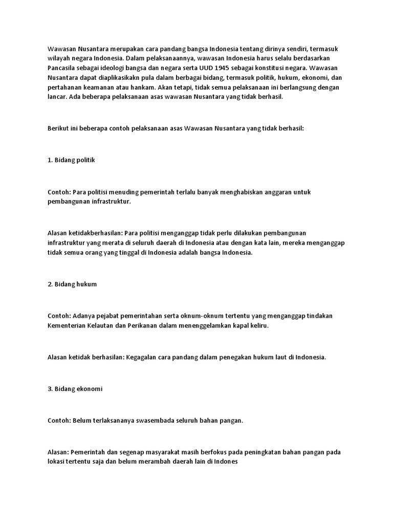 Contoh ketidakberhasilan pelaksanaan asas wawasan nusantara. Diwujudkan setiap wilayah nusantara ialah satu kesatuan politik yaitu negara kesatuan republik indonesia nkri sehingga memiliki rasa. Karena jika masih banyak yang melanggar uu maka belum berhasil untuk mewujudkan asas wawasan nusantara di bidang hukum. Dua hal tersebut diharapkan dapat mengembangkan kehidupan masyarakat dan mengurangi kesenjangan antara daerah satu dengan yang lainnya. Terjadinya pemerataan pembangunan dan pendidikan pada setiap daerah. Pembangunan ekonomi yang berorientasi pada pembangunan sektor pertanian pemerintahan dan perindustrian karena banyaknya sumber daya ekonomi yang memiliki potensi ekonomi tinggi di indonesia. Beberapa contoh keberhasilan pelaksanaan asas wawasan nusantara dapat dilihat dalam hal hal seperti tertera di bawah ini.