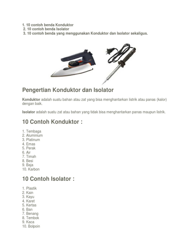 Pengertian konduktor dan isolator konduktor adalah suatu bahan atau zat yang bisa menghantarkan listrik atau panas kalor dengan baik. 10 contoh benda yang menggunakan konduktor dan isolator sekaligus. Langsung saja didalam pengertian konduktor ini adalah suatu zat atau bahan yang dpt menghantarkan arus listrik baik itu zat padat cair ataupun gas karena sifat dari zat atau benda tersebut yang konduktif maka disebut dengan konduktor dan ciri ciri konduktor yang baik itu sendiri memiliki tahanan jenis yang kecil dan salah satu penghantar. Tembaga adalah bahan yang dapat menghantarkan energi listrik atau disebut dengan konduktor.