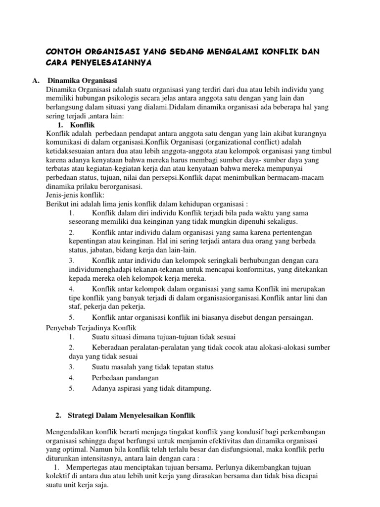 Menurut nardjana 1994 mendefinisikan konflik sebagai akibat situasi dimana keinginan atau kehendak yang berbeda atau berlawanan antara satu dengan yang lain sehingga salah satu atau keduanya saling terganggu. Contoh konflik dan cara penyelesaiannya perusahaan ptindexin dan ptsindo lumber bidang struktur dalam organisasi dan konflik yang sering terjadi di organisasi koperasi telkomsel menyalurkan ide melalui komunikasi dan hambatan dalam komunikasi. Menurut killman dan thomas 1978 konflik merupakan kondisi terjadinya ketidakcocokan antar nilai atau tujuan tujuan yang ingin dicapai baik yang ada dalam diri individu maupun. Hal ini sering terjadi antara dua orang yang berbeda status jabatan bidang kerja dan lain lainkonflik antar individu dan kelompok seringkali berhubungan dengan cara individumenghadapi tekanan tekanan untuk mencapai konformitas yang ditekankan kepada mereka oleh kelompok kerja merekakonflik antar kelompok dalam organisasi yang sama konflik ini merupakan tipe konflik yang banyak terjadi di. Budaya indonesia yang diakui unesco. Demikianlah penjelasan mengenai pengertian jenis contoh dan cara penyelesaian konflik sosial di indonesia.