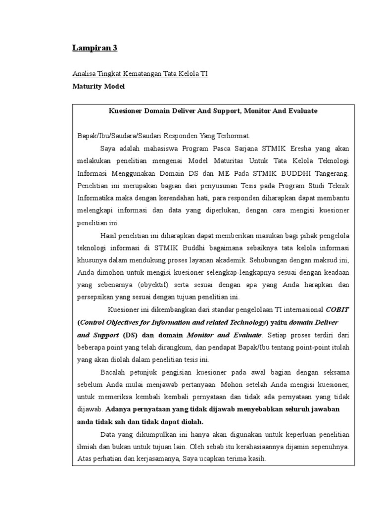 315 contoh kuesioner error. Gambar 46 grafik hasil penilaian kuesioner domain dsserror. Kurang setuju 3setuju 4. Dari hasil studi dokumen wawancara dan kuesioner cobit 5 perusahaan pttelkom johar semarang menghasilkan level kapabilitas proses monitoring evaluasi dan penilaian pengendalian internal mencapai level 4 atau predictable process. 1 domain monitor and evaluate pada pt wijaya karya beton ppb pasuruan analisa maturity level me1 monitor and evaluate it performance bagian sistem informasi umur 32 tanggal 30 jan 13 kuesioner ini ditujukan untuk memperoleh tingkat pengelolaan mengenai kegiatan kegiatan yang berhubungan dengan pengawasan dan evaluasi kinerja ti. Dalam penelitian ini menggunakan model kapabilitas sebagai alat ukur terhadap jawaban responden dari kuesioner yang dibuat berdasarkan framework cobit 5.