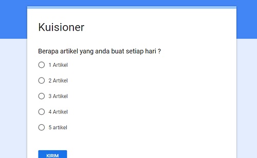 Saya mencoba untuk mencari kata kunci militer indonesia di mesin searching google ya memang sih iseng tapi berikut ini. Cara daftar dan buat akun google gmail dengan mudah dengan google form anda dapat membuat formulir khusus untuk survei dan kuesioner tanpa memerlukan perangkat lunak tertentu. Membuat kuesioner dengan google form part 1 duration. Setelah anda telah selesai buat kuesionernya anda menyebar kuesioner google form dengan tautan atau link. Cara menyebar kuesioner google form dengan tautan atau link. Anda dapat tahu berapa orang yang sudah mengisi kuesionernya dan hasilnya gimana.