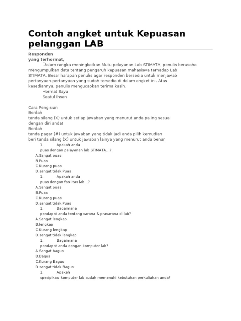 Kuesioner kinerja karyawan. Contoh kuesioner kepuasan pelanggan doc. Berikut adalah contoh kuesioner pemasaran dan pendidikan terkait kepuasan pelanggan pada pemasaransite dalam rangka penyelesaian pendidikan strata 2 s2 adalah sebagai berikut. Contoh kuesioner kinerja karyawan. Sr skor 4 sering. Misalnya kepuasan pelanggan restoran aneka olahan ayam sop survey kepuasan pelanggan puskesmas termasuk bagi pemangku public service yang melayani masyarakat seperti kantor pelayanan perijinan.