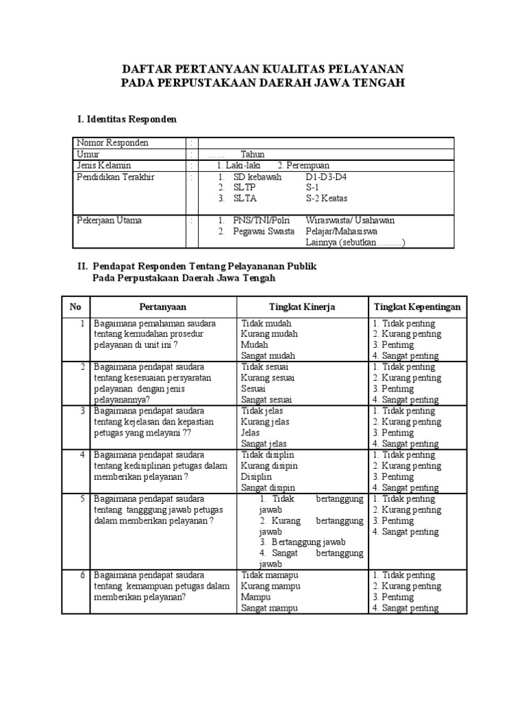 Bila anda ingin tahu cara membuat dan contoh standar operasional prosedur sop anda bisa membaca di sini lengkap. Aturlah bahasa dalam kuesioner sebaik dan semudah mungkin dipahami karena biasanya orang hanya membaca pertanyaan pertanyaan dalam kuesioner sacara cepat. Buat kamu yang mau melakukan penelitian di bawah ini saya berikan contoh kuesioner penelitian oleh salah satu mahasiswa di suatu kampus. Contoh standar operasional prosedur ini dengan form survey kepuasan pelanggan serta contoh format penilaian kepuasan pelanggan semoga bisa bermanfaat dan membantu anda.