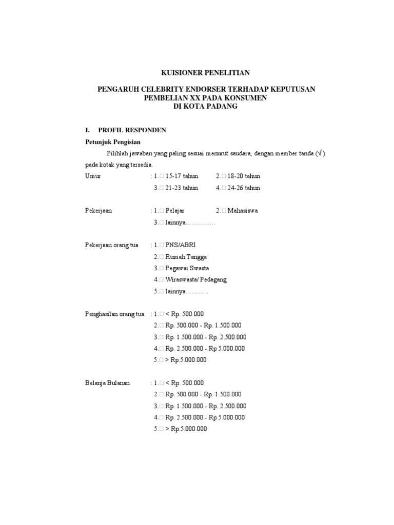 Contoh kuesioner keputusan pembelian. Kuesioner pengaruh harga kualitas produk dan citra merek terhadap keputusan pembelian kecap manis merek bango studi kasus para ibu rumah tangga di komplek villa mutiara johor ii dan taman johor mas bersama ini saya meminta kesediaan ibu untuk mengisi daftar kuesioner yang diberikan. Contoh kuesioner penelitian skripsi kinerja karyawan kepuasan pelanggan terbuka kualitas pelayanan pemasaran produk keputusan pembelian akuntansi evaluasi. Pengaruh harga kualitas produk dan citra merek terhadap keputusan pembelian toko batik sri mulyani di solo. Itulah beberapa contoh dari bentuk dan format kuesioner yang baik dan benar. Kami sangat menghargai kejujuran anda dalam mengisi kuesioner ini. Kuesioner responden yang terhormat penulis adalah salah satu mahasiswa fakultas bisnis dan manajemen universitas widyatama bandung yang pada saat ini sedang menyusun skripsi dengan judul pengaruh store atmosphere terhadap keputusan pembelian pada rumah makan nasi bancakan bandung.