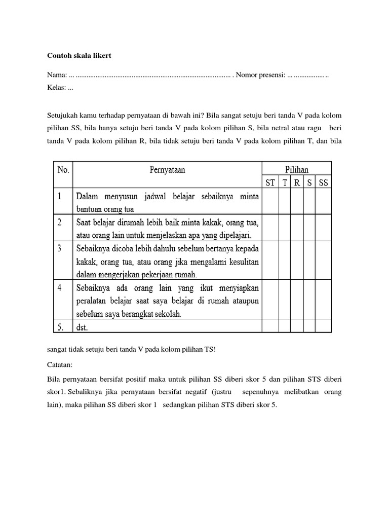 Contoh kedua jam 0000 bukan berarti waktunya kosong atau tidak ada nilainya karena jam 0000 sendiri masih menunjukkan waktu dimana jam 0000 sama dengan jam 12 malam. Sangat setuju ss 5 setuju s 4 netral n 3 tidak setuju ts 2 sangat tidak setuju sts 1 data responden dan semua informasi yang diberikan akan dijamin kerahasiaannyaoleh sebab itu dimohon untuk mengisi kuesioner dengan sebenarnya dan seobjektif mungkin. Skala likert paling banyak digunakan untuk pengukuran perilaku skala yang terdiri dari pernyataan dan disertai jawaban setuju tidak setuju. Sampsplikert contoh sts ts n s ss f 6 20 35 49 10 pfn 0050 0167 0292 0408 0083 pk 0050 0217 0508 0917 1000 pk t05ppk.