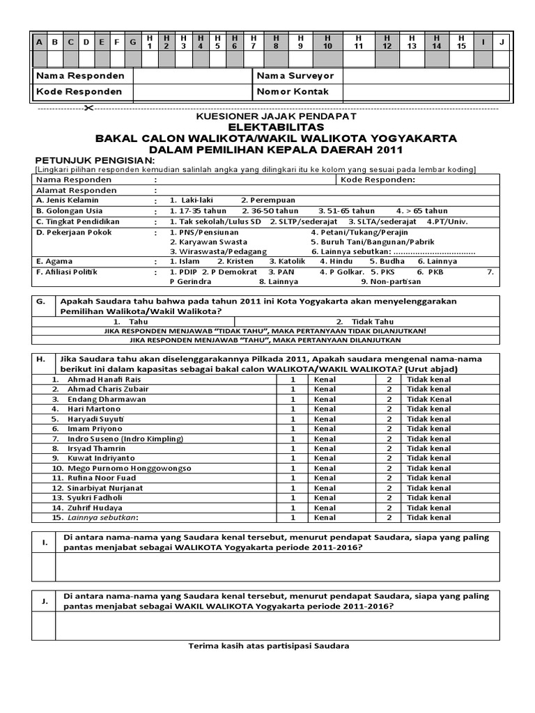 Contoh kuesioner kepuasan pelanggan doc. Kepuasan pelanggan pada bus trans pakuan kota bogor terima kasih atas partipasi anda menjadi salah satu peserta survey dan secara sukarela mengisi kuesioner ini. Selanjutnya diikuti elektabilitas deddy mizwar 227 dedi mulyadi 101 dan dede yusuf 97. Analisis pengaruh kualitas pelayanan terhadap tingkat. Kuisioner survei kepuasan masyarakat di sman 1 gondang mojokerto tahun 2014 2015. Elektabilitas adalah pengertian perbedaan hubungan cara meningkatkan untuk pembahasan kali ini kami akan memberikan ulasan mengenai elektabilitas yang dimana dalam hal ini meliputi pengertian.