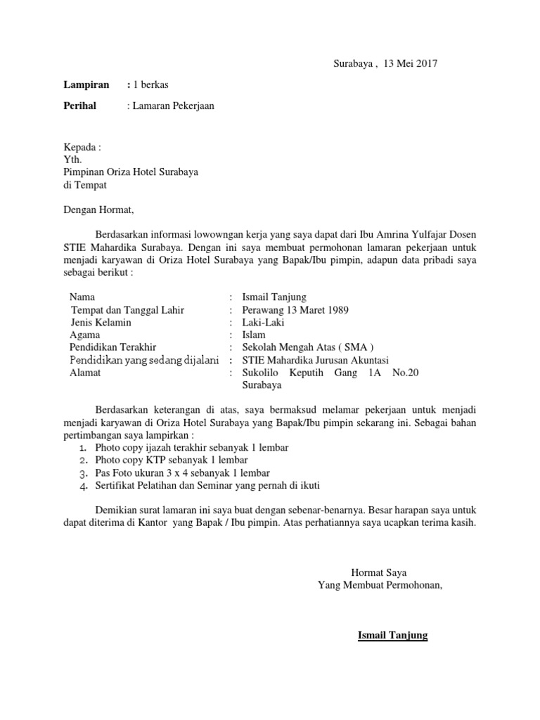 Contoh surat lamaran kerja di hotel pada kesempatan kali ini kita masih akan membahas mengenai materi seputar surat lamaran kerjabedanya kali ini lamaran pekerjaan tersebut akan ditujukan kepada sebuah hotel. Apalagi ketika anda mengirimkan surat lamaran ke perusahaan yang sudah terkenal dan memiliki nama. Contoh surat lamaran kerja di hotel musim liburan seperti liburan sekolah tahun baru dan hari hari besar lainnya merupakan hari tersibuk dan terpadat dalam sebuah hotel. Contoh surat lamaran kerja di perusahaan seringkali dicari oleh para pencari kerja yang ingin mengajukan lamaran pekerjaan di perusahaan perusahaan yang ada di indonesia. Langsung saja kita simak pembahasan contoh surat lamaran kerja di hotel berikut ini. Maka dari itu buatlah sebaik mungkin dan hindari penggunaan kata yang tidak baku.