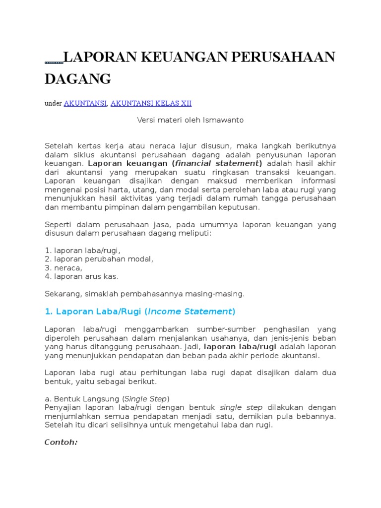 Contoh laporan keuangan perusahaan dagang. Ada juga contoh laporan keuangan dalam versi bahasa inggris. Sebelum masuk lebih jauh membahas mengenai laporan keuangan perusahaan dagang tidak ada salahnya kita mengenal lebih dekat lagi tentang perusahaan dagang mulai dari pengertian perusahaan dagang. Masing masing contoh laporan keuangan terdiri dari 5 jenis laporan keuangan utama yaitu. Perusahaan dagang adalah perusahaan yang kegiatan usaha nya menjual suatu produk dari supplyer kepada konsumen dengan atau tanpa merubah baik bentuk rasa atau kualitas dan memperoleh keuntungan dari hasil selisih penjualan. Laporan keuangan neraca pada perusahaan dagang dan perusahaan jasa tidak jauh berbeda hanya pada perusahaan dagang ada perbedaan pada persediaan barang dagang. Sehingga balance pada nilai rp.