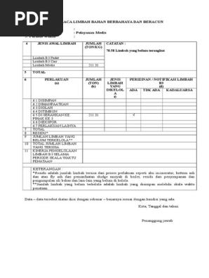 Contoh laporan limbah b3. Limbah tidak memiliki nilai dan harus diolah atau dibuang. Bpelaksanaan penyimpanan limbah b3. Daftar contoh limbah b3 padat cair gas yang bersifat mudah meledak terbakar beracun korosif menyebabkan infeksi serta berasal dari lingkungan rumah tangga sekolah dan rumah sakit. 1 jika masuknya limbah b3 tidak per hari maka pengisian form ini disesuaikan dengan masuknya limbah ke tempat penyimpanan 2 batas waktu penyimpanan di tempat penyimpanan disesuaikan dengan diktum keempat dalam sk menlh ini. 1substansi laporan pengelolaan limbah b3 untuk kegiatan penyimpanan limbah b3 pasal 28 pp 101 thn 2014 paling sedikit memuat. Contoh format neraca limbah b3 69.