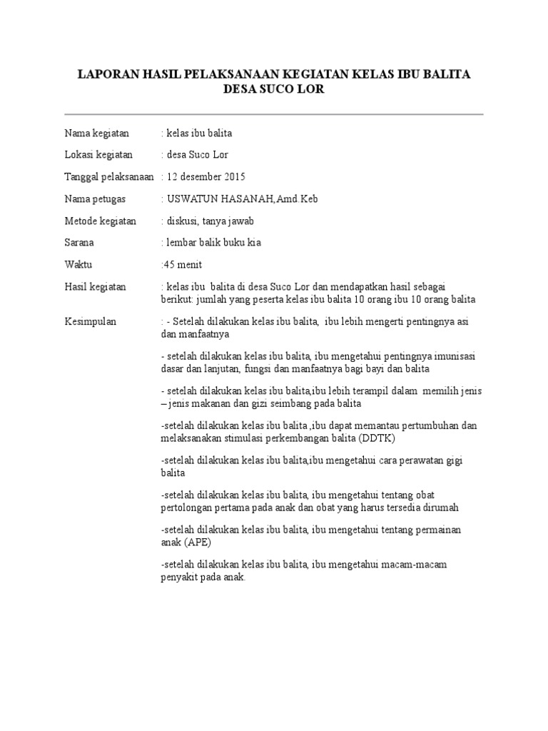Academiaedu is a platform for academics to share research papers. Kegiatan itu bisa bermacam macam baik dari segi tempat waktu maupun jenisnya. Pelaksanaan kegiatan yang seharusnya dilakukan pada jam 1400 sayangnya harus mundur menjadi pukul 1455 dikarenakan beberapa alasan yaitu masih banyaknya petani yang bekerja di sawah atau petani yang memiliki kepentingan lainnya. Contoh laporan hasil kegiatan. Contoh laporan kegiatan laporan kegiatan adalah sebuah laporan tentang hasil kegiatan tertentu. Pelaksanaan kegiatan yang seharusnya dimulai pada jam 0900 sayangnya harus mundur menjadi 1000 dikarenakan alasan seperti masih banyak para petani yang bekerja di sawah dan petani yang mempunyai kepentingan lainnya.
