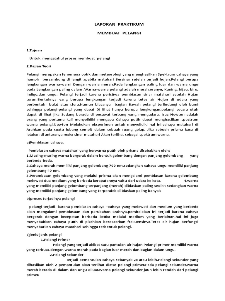 Contoh laporan percobaan membuat pelangi. Laporan percobaan membuat pelangi disusun oleh annisa alimatul k dan charolina sahara smp n 1 prambanan klaten. Rpp revisi 2016 bahasa indonesia smp kelas 9 rpp diva pendidikan pic. Langkah pertama dalam membuat teks laporan percobaan ialah terlebih dahulu dengan cara membuat struktur teks laporan percobaan. Berikut adalah contoh laporan percobaan membuat pelangi yang bisa kamu lakukan di dalam ruangan menggunakan beberapa peralatan sederhana. Contoh laporan percobaan membuat pelangi annisa alimatul. Laporan percobaan membuat pelangi.