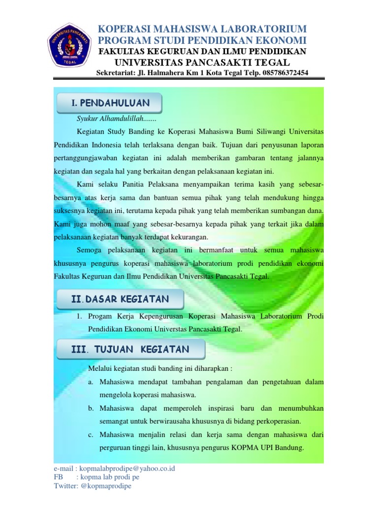 10 ponorogo 63471 jawa timur indonesia telp 0352 481124 fax. Dalam penyusunan laporan ini tidak sedikit hambatan yang penulis hadapi. Atas perhatian dukungan dan bantuan saudarai bapak dan ibu sekalian kami ucapkan terima kasih. Mencari contoh pelayanan pendidikan yang berkwalitas. Kegiatan study banding ke koperasi mahasiswa bumi siliwangi universitas pendidikan indonesia telah terlaksana dengan baik. Inilah rekomendasi tentang contoh laporan pertanggungjawaban kegiatan studi banding.