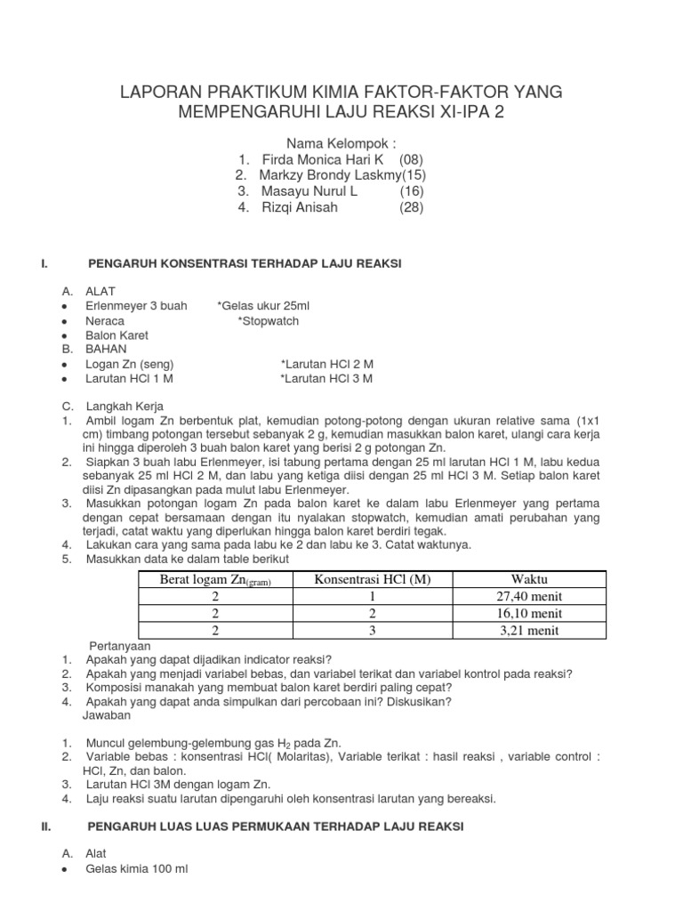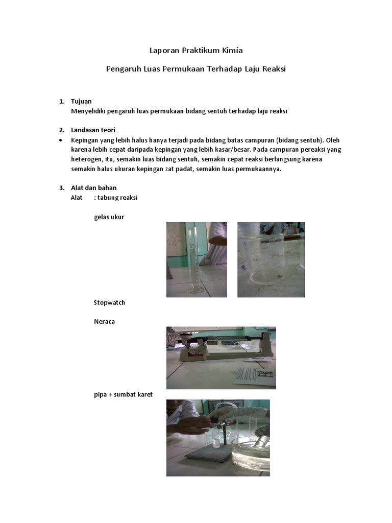 Contoh laporan praktikum laju reaksi. Pada percobaan pertama dilakukan pengamatan faktor laju reaksi yaitu konsentrasi yang dilakukan dengan mereaksikan pita magnesium bersama hcl yang konsentrasinya berbeda beda. Contoh laporan praktikum kimia. Laju reaksi menyatakan molaritas zat terlarut dalam reaksi yang dihasilkan tiap detik reaksi. Perkaratan besi merupakan contoh reaksi kimia yang berlangsung lambat sedangkan peledakan mesiu atau kembang api adalah contoh reaksi yang cepat. Pada praktikum kali ini telah dilakukan percobaan mengenai faktor faktor yang mempengaruhi laju reaksi. Laju reaksi adalah laju penurunan reaktan pereaksi atau laju bertambahnya produk hasil reaksi.
