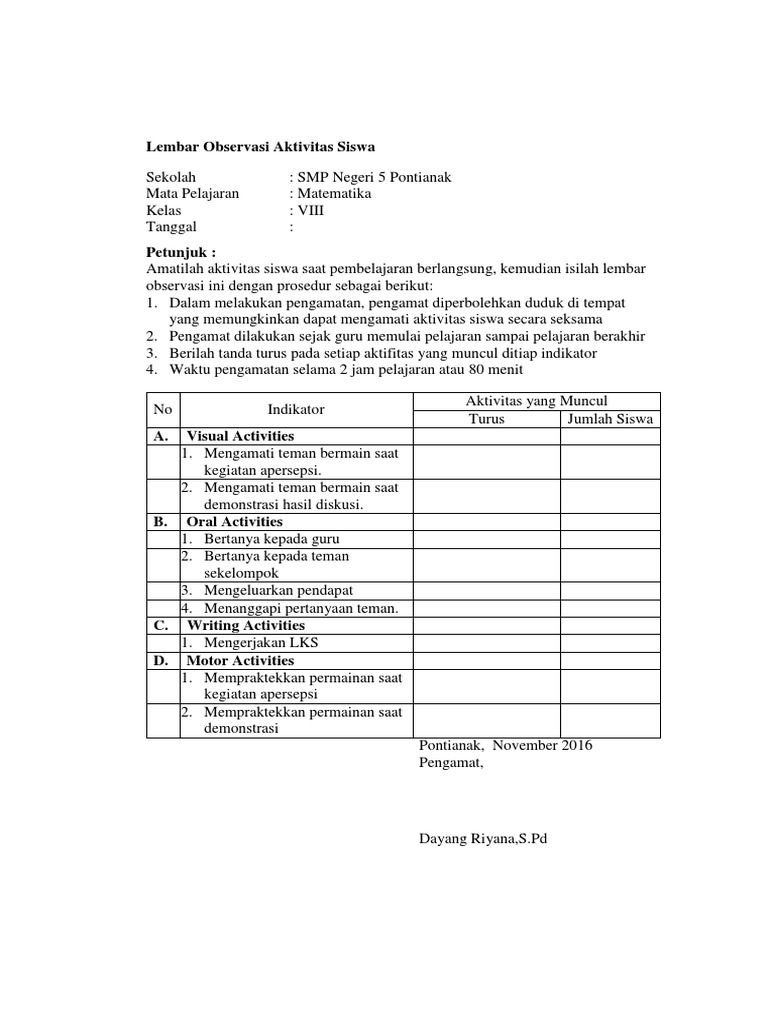 Doc Contoh Lembar Observasi Aktivitas Belajar Siswa Siti