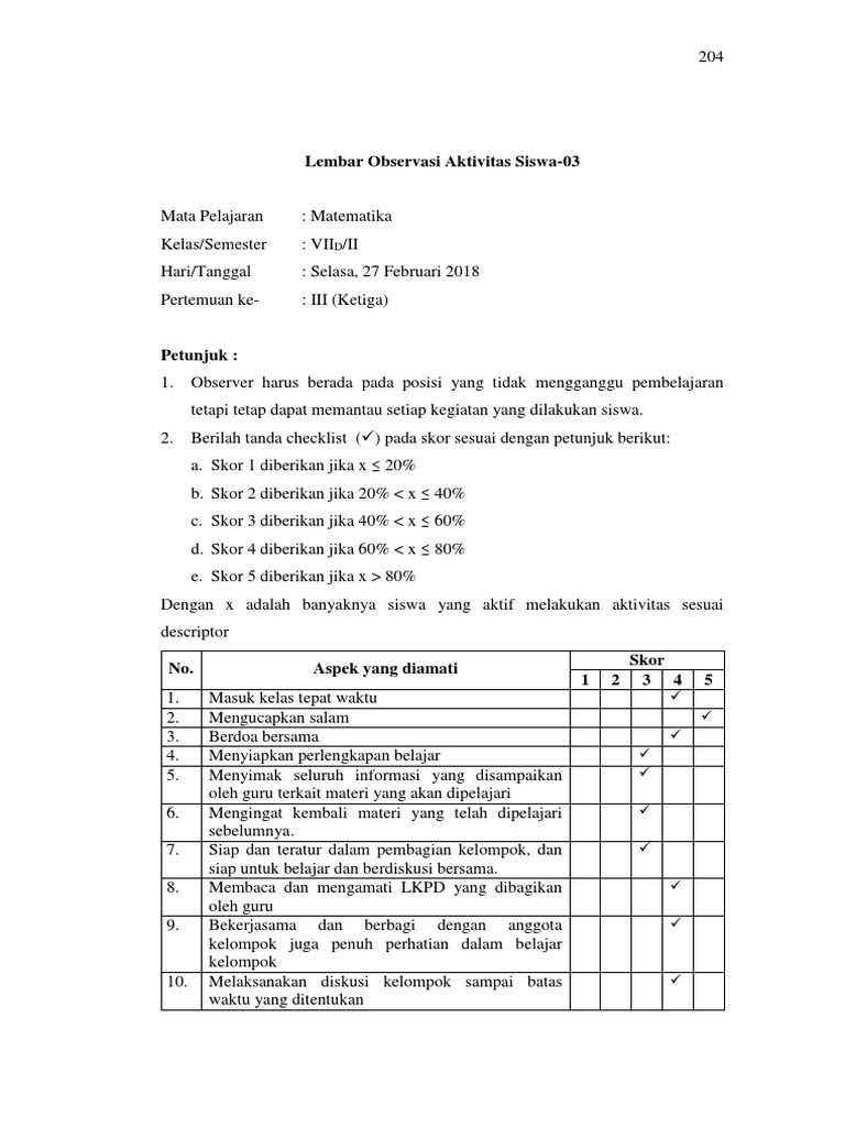 Mendengarkan penjelasan peneliti mencatatmenyalin pelajaran bertanya menjawabmenanggapi pertanyaan meminta bimbingan kepada peneliti mengumpulkan tugas dan mempresentasikan tugasnya. Sedang mencari contoh lembar observasi aktivitas belajar siswa untuk penelitian anda. Okeh tanpa panjang lebar langsung saja ini adalah contoh lembar observasi siswa yang saya buat semoga bermanfaat. Weleh2 waktu yang lalu gue lupa berbagi contoh lembar observasi lingkungan sekolah untuk kegiatan ppl praktek. Rumus trigonometri setengah sudut lks tes formatif. Instrumen yang digunakan dalam observasi berupa lembar observasi atau jurnal.