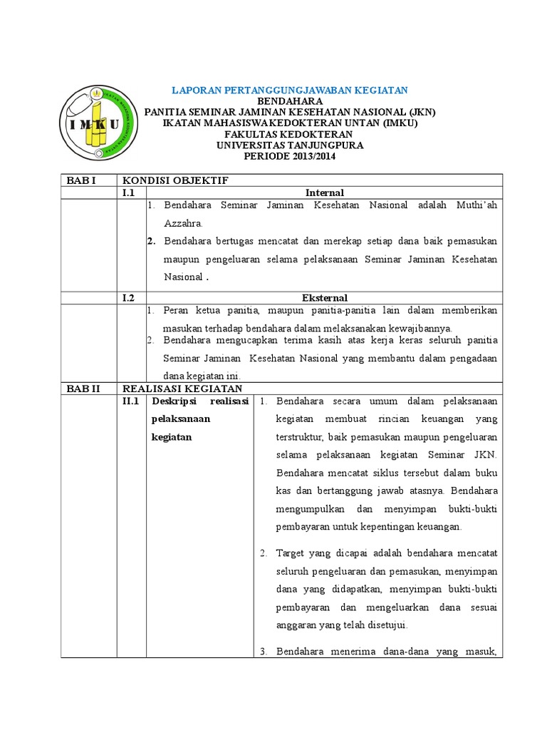 Contoh lpj bendahara kegiatan. Contoh lpj laporan pertanggung jawaban kegiatan. Laporan pertanggung jawaban merupakan suatu hal yang wajib di buat seusai menyelenggarakan suatu kegiatan. Lpj dibuat oleh bendahara setiap bulan dan disampaikan paling lambat tanggal 10 bulan berikutnya atau hari kerja berikutnya jika tanggal 10 adalah hari libur kepada kppn. Laporan pertanggungjawaban laporan pertanggungjawaban lpj contoh bendahara formatnya laporan pertanggungjawaban adalah suatu dokumen tertulis yang disusun dengan tujuan memberikan laporan tentang pelaksanaan kegiatan dari suatu unit organisasi. Laporan pertanggungjawaban lpj bendahara pengeluaran dibuat sebagai wujud dari pertanggungjawaban bendahara atas uang yang dikelolanya. Contoh lpj kegiatan contoh lpj kegiatan desa seminar pramuka pelatihan mahasiswa osis dll hallo sahabat pembaca yang budiman pada kesempatan kali ini penulis akan berbagi ilmu tentang pembuatan contoh lpj suatu kegiatanlpj dalam suatu kegiatan ini sangat penting untuk kita pelajari karena menyangkut laporan laporan pertanggung jawaban hasil kerja dalam suatu kegiatan.