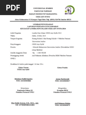 0800 selesai tempat. Contoh lpj kegiatan contoh lpj kegiatan desa seminar pramuka pelatihan mahasiswa osis dll hallo sahabat pembaca yang budiman pada kesempatan kali ini penulis akan berbagi ilmu tentang pembuatan contoh lpj suatu kegiatanlpj dalam suatu kegiatan ini sangat penting untuk kita pelajari karena menyangkut laporan laporan pertanggung jawaban hasil kerja dalam suatu kegiatan. Laporan pertanggungjawaban bertujuan untuk melaporkan hasil dari sebuah kegiatan kepihak terkait dengan membuat laporan pertanggung jawaban kita juga dapat melihat kelemahan dan kelebihan lomba yang kita adakan. Universitas katolik parahyangan ii3 struktur kepanitiaan ii4 susunan kepanitiaan pelindung rektor unika parahyangan. Laporan pertanggungjawaban laporan pertanggungjawaban lpj contoh bendahara formatnya laporan pertanggungjawaban adalah suatu dokumen tertulis yang disusun dengan tujuan memberikan laporan tentang pelaksanaan kegiatan dari suatu unit organisasi. Open talk 2017 bersinergi membangun fakultas farmasi.