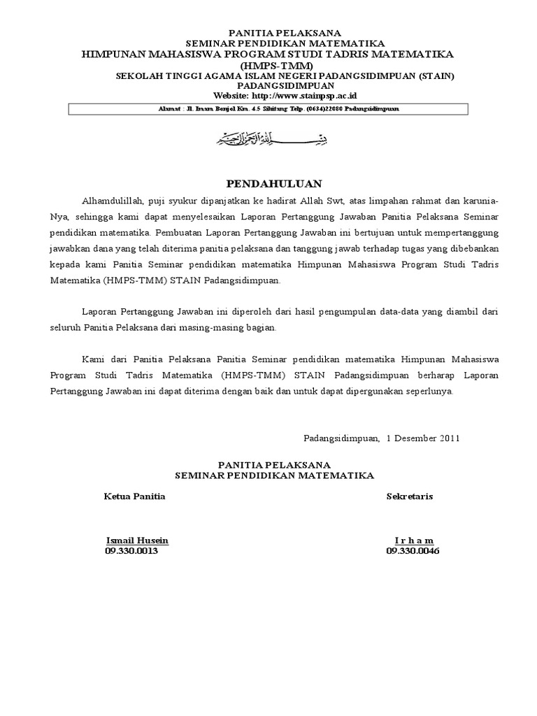Contoh lpj kegiatan seminar. Pendidik merupakan tenaga profesional yang bertugas merencanakan dan melaksanakan proses pembelajaran menilai hasil pembelajaran melakukan pembimbingan dan pelatihan serta melakukan penelitian dan pengabdian kepada masyarakat terutama bagi pendidik pada perguruan tinggi. Contoh lpj kegiatan contoh lpj kegiatan desa seminar pramuka pelatihan mahasiswa osis dll hallo sahabat pembaca yang budiman pada kesempatan materi terbaru. Untuk teman teman yang suka berorganisasi ada baiknya kita menyibukkan diri dalam suatu kegiatan. Berikut ini saya berikan contoh lpj seminar. Contoh lpj kegiatan contoh lpj kegiatan desa seminar pramuka pelatihan mahasiswa osis dll hallo sahabat pembaca yang budiman pada kesempatan kali ini penulis akan berbagi ilmu tentang pembuatan contoh lpj suatu kegiatanlpj dalam suatu kegiatan ini sangat penting untuk kita pelajari karena menyangkut laporan laporan pertanggung jawaban hasil kerja dalam suatu kegiatan. Ada beberapa hal yang harus diperhatikan si penulis laporan dalam pembuatan laporan.