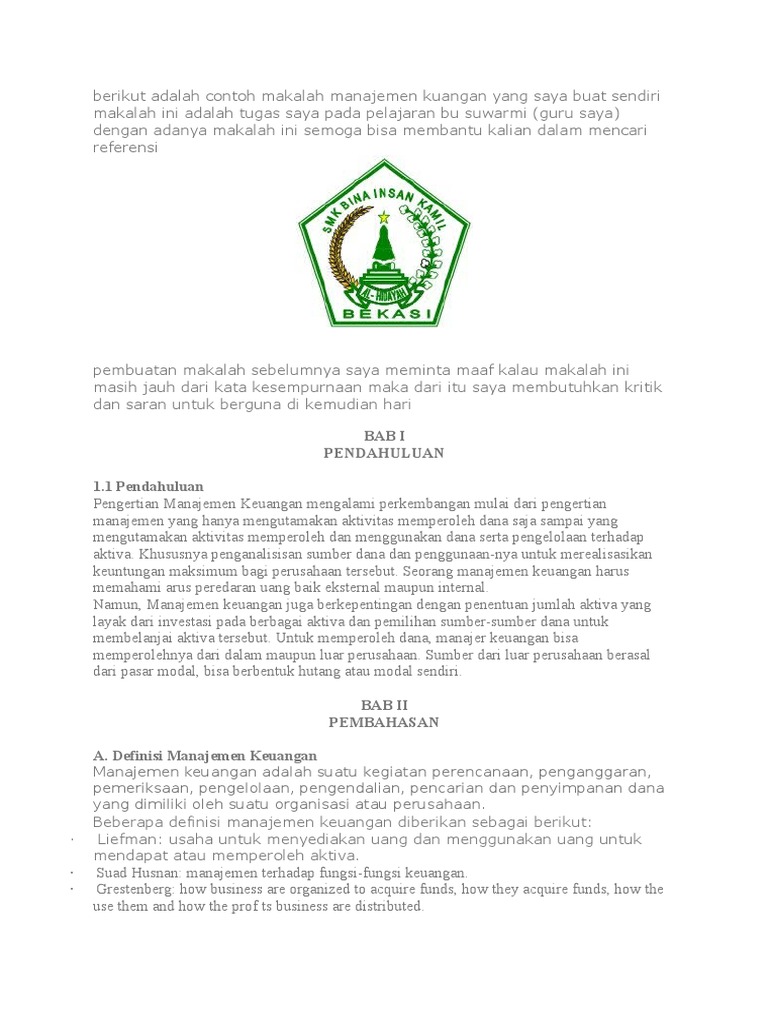 Contoh makalah manajemen keuangan. Dari uraian dan contoh kasus diatas dapat ditarik kesimpulan bahwa perencanaan keuangan sangat penting bagi setiap perusahaanuntuk menyusun rencana keuangan seberapa besar dana yang harus dikeluarkanterutama pihak manajemen apabila perencanaan keuangan disajikan dengan baik dan benar tentunya peramalan keuangan untuk jangka waktu yang akan datang akan terlaksana dengan baik pula. Definisi manajemen keuangan 1pengertian manajemen keuangan mengalami perkembangan mulai dari pengertian manajemen yang hanya mengutamakan aktivitas memperoleh dana saja sampai yang mengutamakan aktivitas memperoleh dan menggunakan dana serta pengelolaan terhadap aktivabeberapa definisi manajemen keuangan diberikan sebagai berikut. Manajemen keuangan adalah salah satu bagian yang amat esensial dalam segala hal yang berkaitan dengan kegiatan ekonomi. Prinsip ini disebut sebagai prinsip manajemen keuangan. Tujuan manajemen keuangan adalah untuk memaksimalkan nilai perusahaandengan demikian apabila suatu saat perusahaan dijual maka harganya dapat ditetapkan setinggi mungkin. Semoga materi yang kami berikan dan jangan lupa juga untuk menyimak makalah sistem adminstrasi negara indonesia yang telah kami posting sebelumnya.