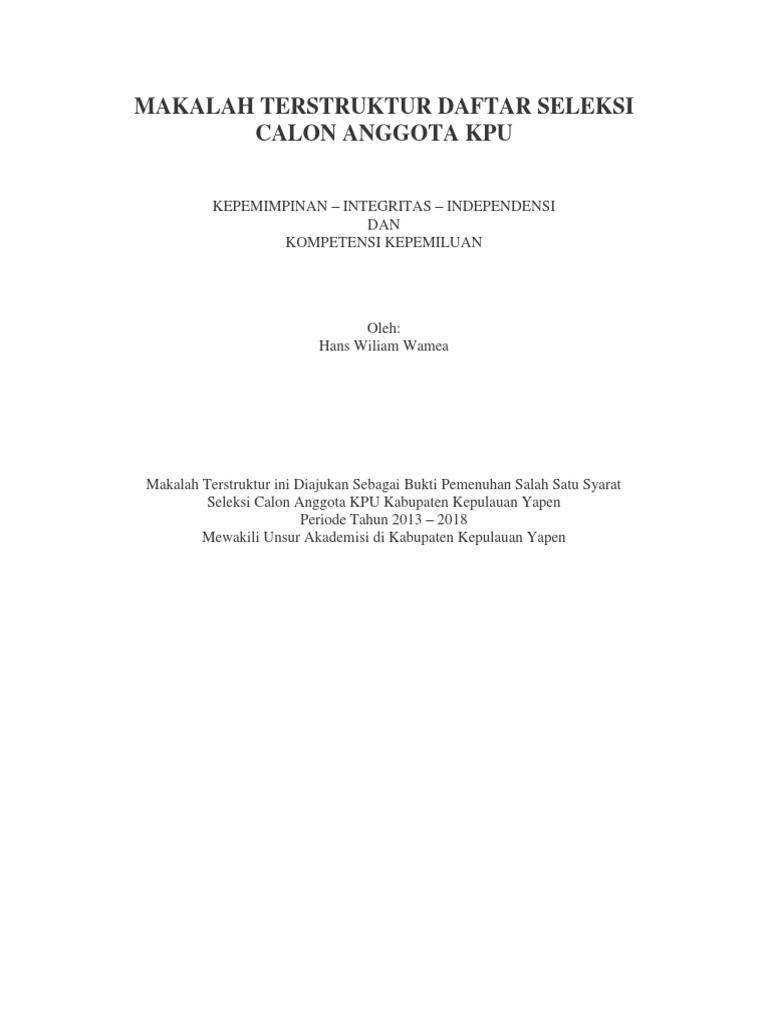 Pedoman penyusunan makalah terstruktur petunjuk. Pembentukan panwaslu di 11 sebelas kabupatenkota dalam provinsi sumatera. Bakal calon anggota bawaslu provinsi menyusun makalah personal esai yang diketik menggunakan komputer dengan ketentuan mengunakan bahasa indonesia 15 spasi font calibri body ukuran 12 setiap bagian pertanyaan dijawab dalam kertas terpisah dan diserahkan kepada tim seleksi pada saat pendaftaran. Rekrutmen kpu bawaslu jakarta suara karya. Academiaedu is a platform for academics to share research papers. Membangun aparatur dan kelembagaan pengawas pemilu yang kuat mandiri dan solid.