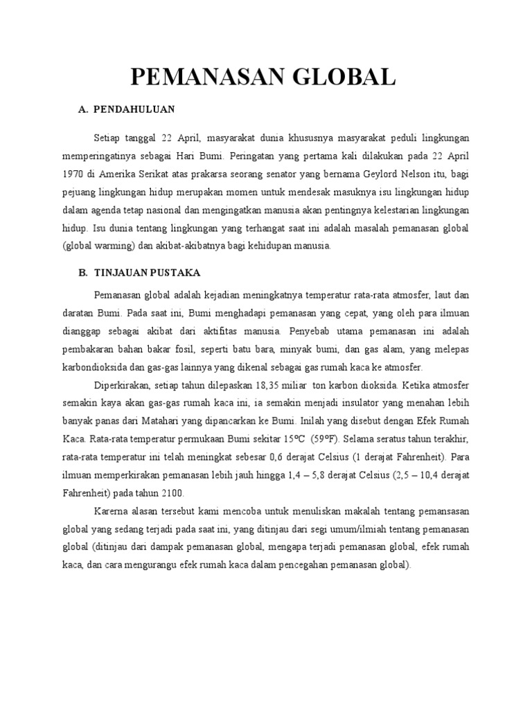Contoh makalah tentang pemanasan global. Banyak faktor atau penyebab yang membuat pemanasan global itu sendiri terjadi. Pemanasan global akan diikuti dengan perubahan iklim seperti menungkatnya curah hujan dibeberapa belahan dunia sehingga menimbulkan banjir dan erosi. Dengan adanya makalah ini saya berharap kita semua dapat lebih mengetahui tentang bagaimana pemanasan global itusemoga dengan makalah ini dapat memberikan wawasan yang lebih luas lagi kepada kita semua. Pemanasan global global warming pengertian proses penyebab dampak dan penanggulangi untuk pembahasan kali ini kami akan mengulas mengenai pemanasan global yang dimana dalam hal ini meliputi proses penyebab dampak dan penanggulangi nah agar dapat lebih memahami dan dimengerti simak ulasan selengkapnya dibawah ini. Karerna alasan tersebut kami mencoba untuk menuliskan makalah tentang pemansasan global yang sedang terjadi pada saat ini yang ditinjau dari segi umumilmiah dan berdasarkan agama khususnya pandangan umat islam tentang pemanasan global ditinjau dari akibat pemanasan global mengapa terjadi pemanasan global dan cara pencegahan pemanasan global. Maka hal itu bisa di jadikan contoh bagi kota kota lain.