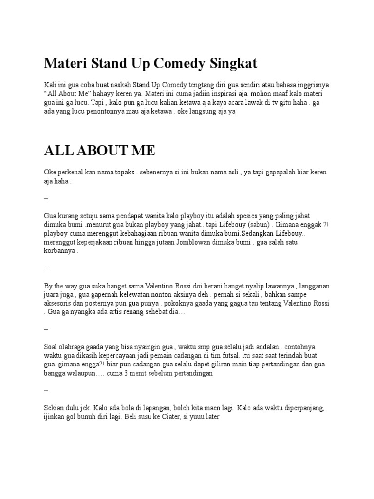 Contoh materi stand up comedy lucu. Bagi kamu yang lagi bingung cari materi stand up comedy lucu naskah stand up comedy terlucu bahan stand up comedy teks stand up comedy materi stand up comedy paling lucu. Dan gue itu baru pertama kali stand up comedy jd kalo misalkan kurang lucu. Kalian ketawa aja biar di kirain. Kamu bisa mengeksplornya dengan gayamu sendiri. Materi stand up comedy lucu tentang sekolah ini bukan contoh naskah teks kata kata untuk materi stand up komedi paling lucu ala comic komika tenar macam. Bila anda ingin membuat ide materi stand up comedy pekerjaan naskah singkat ini bisa menjadi contoh buat kamu.