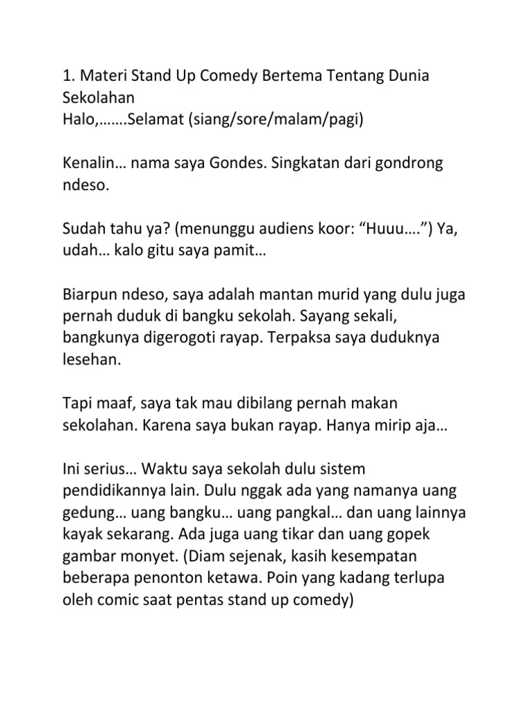 Contoh materi stand up comedy. Materi stand up comedy teman dlawakan lucu indonesia kali ini saya akan berbagi contoh materi mengenai stand up comedy tetapi sebelum memulai materi stand up comedy lebih baiknya kita tahu dulu apa sih yang dinamakan stand up comedi itu mari kita simak ulasan berikut ini. Bagi kamu komika pemula sebelum menjadi komika sesungguhnya kamu. Namun ada enak dan tidak enaknya di sekolah. Comic membawakan lawakannya di atas panggung seorang diri biasanya di depan pemirsa langsung dengan cara bermonolog mengenai sesuatu topik. Disinilah tempatnya ada banyak contoh teks naskah dan materi stand up comedy lucu dengan berbagai tema. Materi stand up comedy lucu tentang sekolah ini bukan contoh naskah teks kata kata untuk materi stand up komedi paling lucu ala comic komika tenar macam.