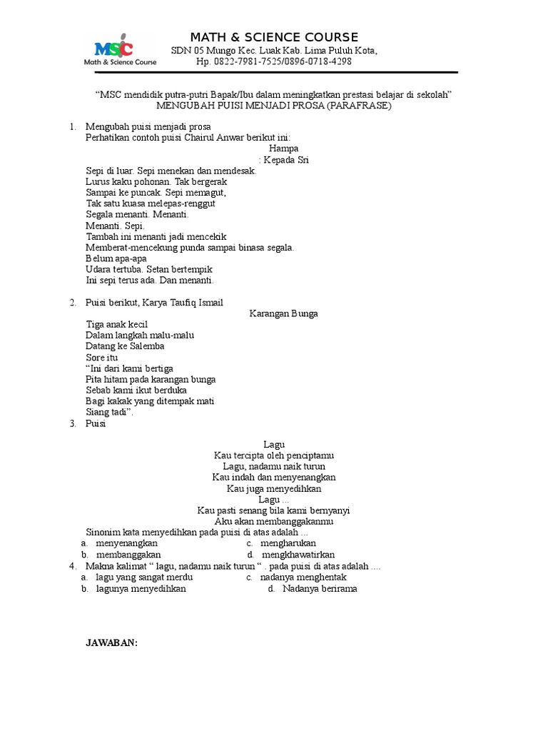 Contoh mengubah puisi menjadi prosa. Mengubah puisi menjadi prosa pernahkah kamu merasa bosan dengan tampilan puisi puisimu yang gitu gitu aja. Kamu mesti tahu bahwa mengolah puisi menjadi prosa dinamakan parafrase puisi. Parafrase terikat adalah mengubah puisi menjadi prosa dengan cara menambahkan atau menyisipkan sejumlah kata pada puisi. Mengubah puisi ke dalam bentuk prosa puisi adalah karangan yang bentuknya terikat dan bahasanya singkat tetapi bermaknabentuknya terikat karena di dalam puisi mempunyai aturan aturan yaitua diikat adanya baitb diikat adanya larik atau baris tiap baitc diikat adanya jumlah suku kata tiap larik atau barisd diikat adanya sajak atau rima yaitu persamaan bunyie diikat adanya irama atau. Parafrase bebas adalah mengubah puisi menjadi prosa dengan kata kata sendiri. Pengertian puisi jenis dan struktur puisi.